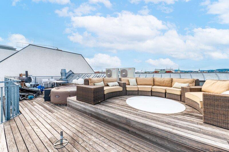 Ein weiteres Highlight ist die Dachterrasse: Auf über 50 m² eröffnet sie einen spektakulären Blick über Wien und verwandelt sich in eine private Oase hoch über der Stadt.