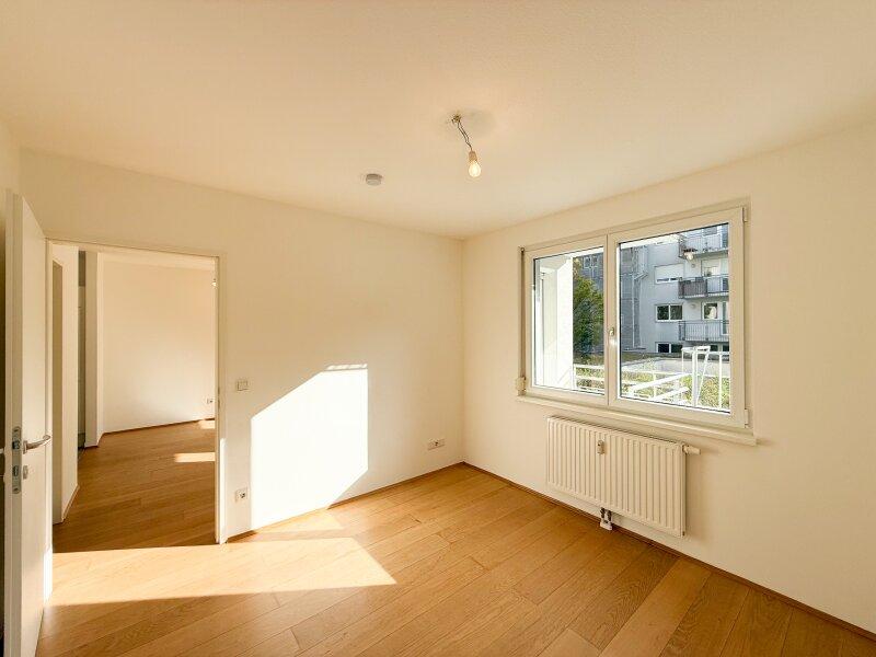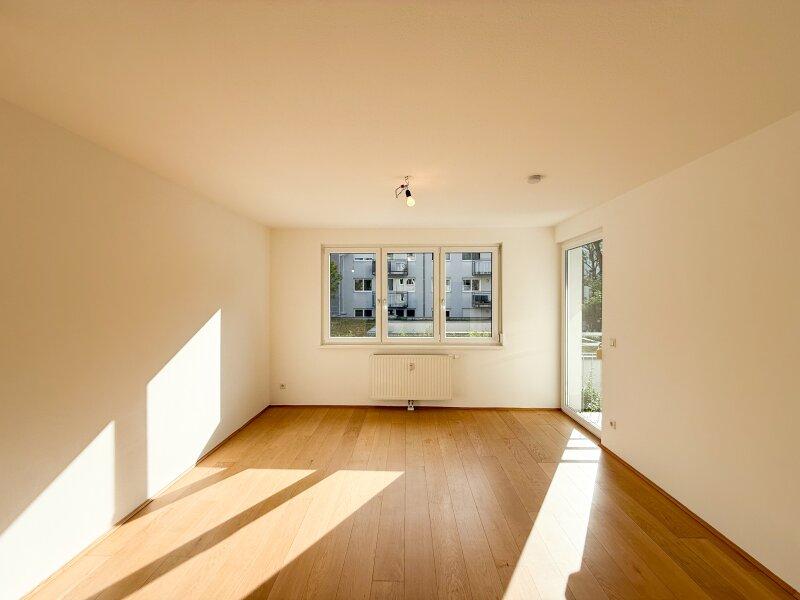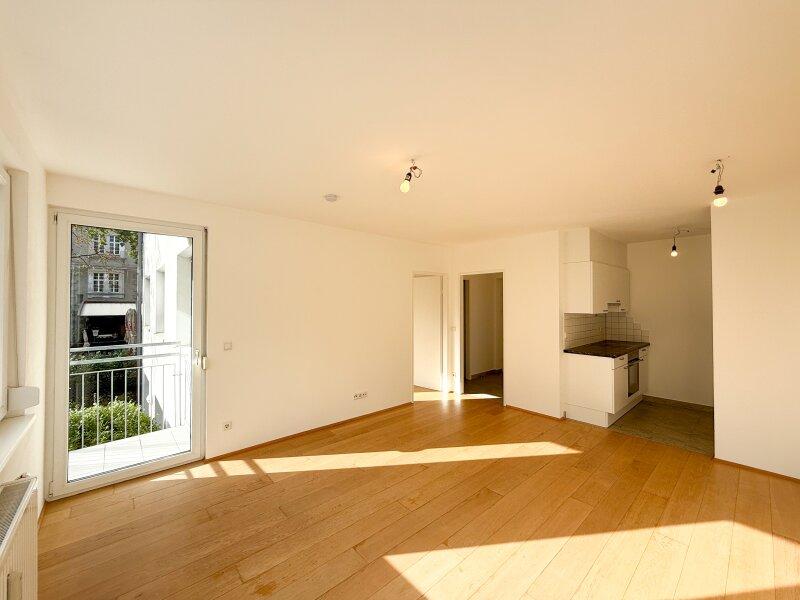 Das Wohnzimmer ist mit einer Einbauküche ausgestattet, von diesem aus ist auch der zum Innenhof gerichtete Balkon zu begehen, das Schlafzimmer befindet sich nebenan.
