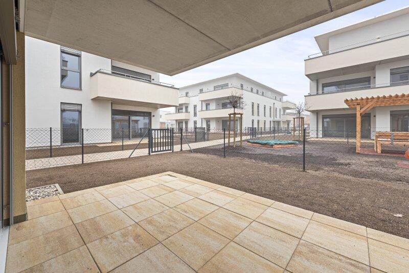 Fahrradabstellplätze, Kinderwagenraum, Spielplatz mit Pergola und Sitzmöglichkeiten sowie eine Tiefgarage vervollständigen das Angebot des durchdachten, modernen und nachhaltigen Projekts. Ein Tiefgaragenplatz ist zu erwerben (ab € 17.500,).