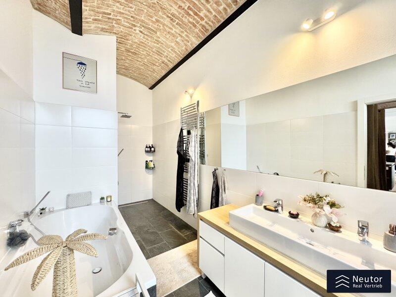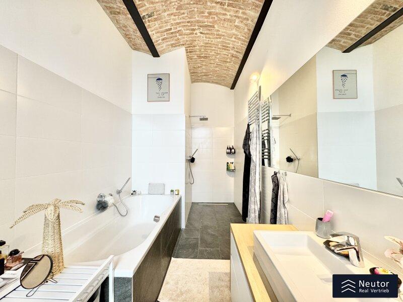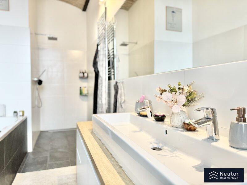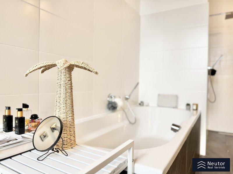 - stilvoll verfliestes Bad mit XXL Badewanne und Walk-In Dusche