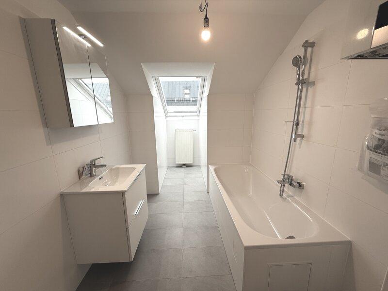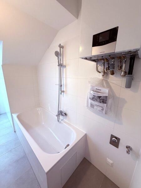 - Badezimmer mit Wanne, Waschbecken, Fenster und Waschmaschinenanschluss