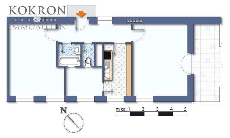 Das Schlafzimmer (ca. 17,8 m²) ist hell und südtseitig ausgerichtet, das Badezimmer (ca. 2,4m²) verfügt über eine Badewanne, das WC ist separat mit Lüftuing, über die Küche (ca.7,6m²) gelangen Sie in einen extra Raum (ca. 5,4m²), welcher aktuell als Büro genutzt wird.
