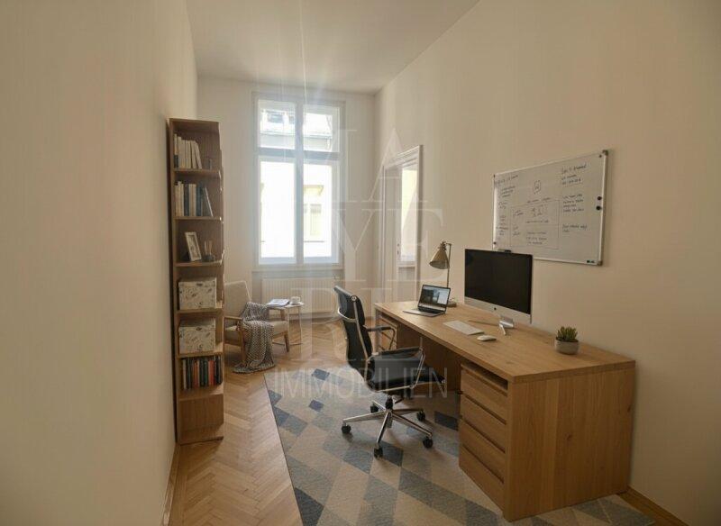 big enough for a dining corner, behind the kitchen is a small room with 12 m2, which can be used as study or similar and a spacious bedroom -facing the quiet backyard of the building.