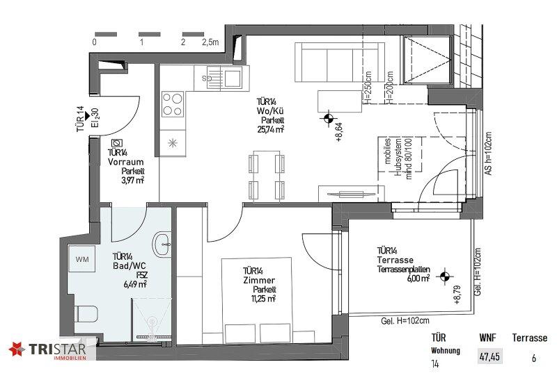 - WNFL ca. 47,45 m² (2 Zimmer) + Terrasse ca. 6 m² + ER (Keller) ca. 2,75 m²