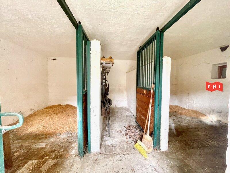 Nebengebäude/Stallungen ca. 175m²: Ziegelmassiv bestehend aus 9 Pferdeboxen, Sattelkammer, Stüberl, Bad u. WC, Empfangsraum mit Fliesen u. Holzdecke - beheizbar ca. 19,5m², Werkstatt ca. 32m², sowie ein Lagerraum