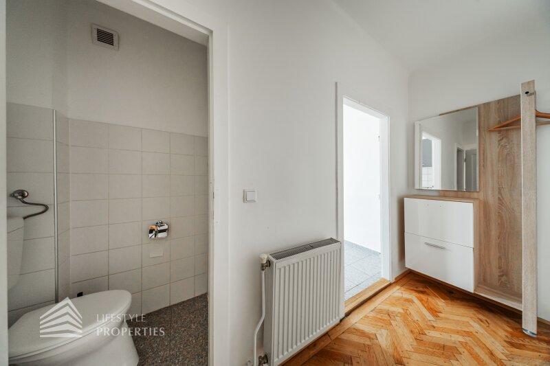 Sie betreten die Wohnung und befinden sich im Vorraum. Linkerhand gelangen Sie in den Wohn- Schlafraum. Des Weiteren gelangen Sie vom Vorraum in die voll ausgestattete Küche und in das Bad mit Fenster. Dieses ist mit einer Dusche und einem Waschbecken ausgestattet. Das separate WC ist auch vom Vorraum erreichbar.