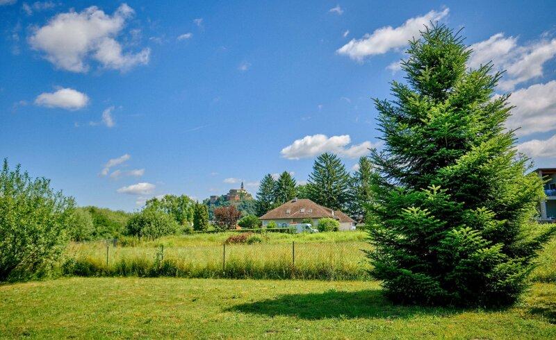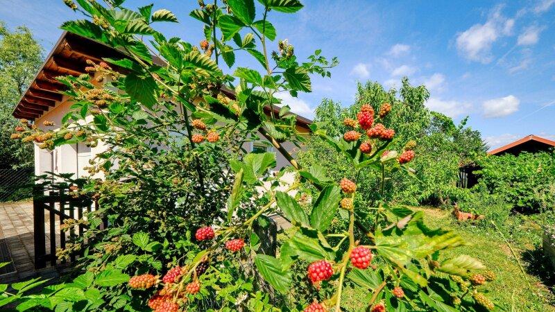 Das teilunterkellerte Gebäude mit Erdgeschoß und Rohdachboden ist in eine grüne Umgebung eingebettet.
