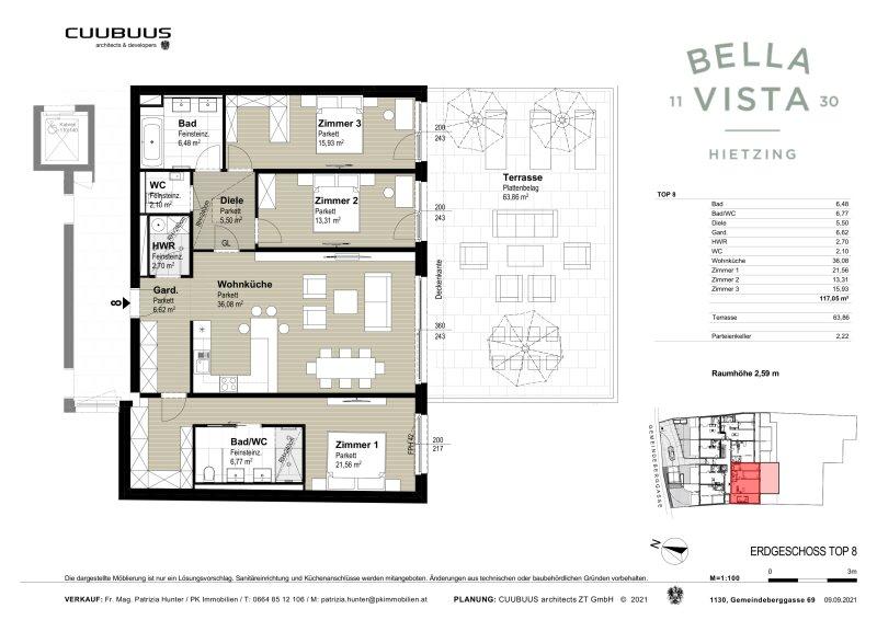 Bei Top 08 handelt es sich um eine gut strukturierte 4 Zimmerwohnung bestehend aus Voraum, Wohn- Essbereich, 3 Schlafzimmern, 2 Bäder und Terrasse.
