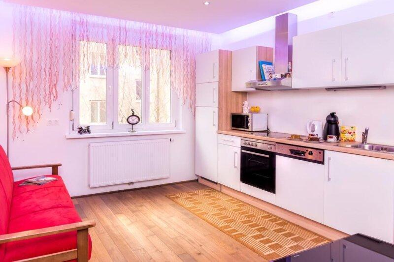 Im Zuge einer Grundrissänderung wurde die ehemalige separate Küche zu einem zweiten, kleineren Schlafzimmer umgestaltet und die Küche wurde im mittleren Zimmer installiert, sodass man eine gemütliche Wohnküche zwischen den beiden Schlafzimmern geschaffen hat.