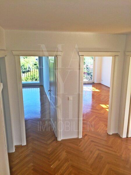 Zwei geräumige Schlafzimmer mit Zugang zum gartenseitigen Balkon, ein weiteres Zimmer ideal als Kinder- oder Arbeitszimmer nutzbar sowie ein modernes Badezimmer mit Badewanne, Dusche und Toilette.