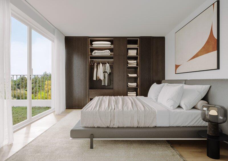 Elektrische Außenjalousien, hochwertiges Echtholzparkett und große Fenster schaffen eine helle und einladende Atmosphäre. Die integrierte Fußbodenheizung und Kühlung sorgt für das perfekte Raumklima zu jeder Jahreszeit.
