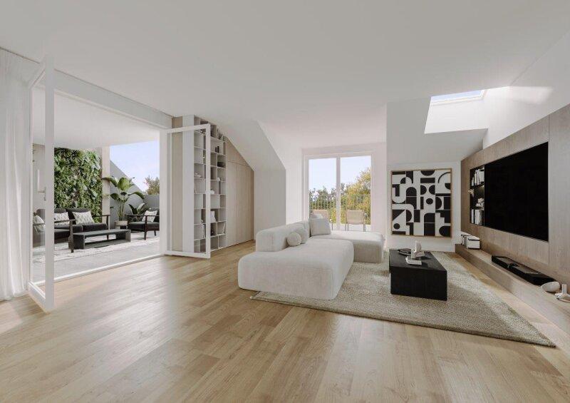Elektrische Außenjalousien, hochwertiges Echtholzparkett und große Fenster schaffen eine helle und einladende Atmosphäre. Die integrierte Fußbodenheizung und Kühlung sorgt für das perfekte Raumklima zu jeder Jahreszeit.