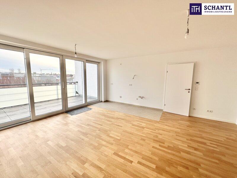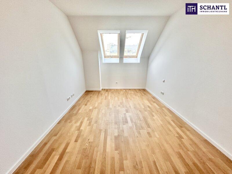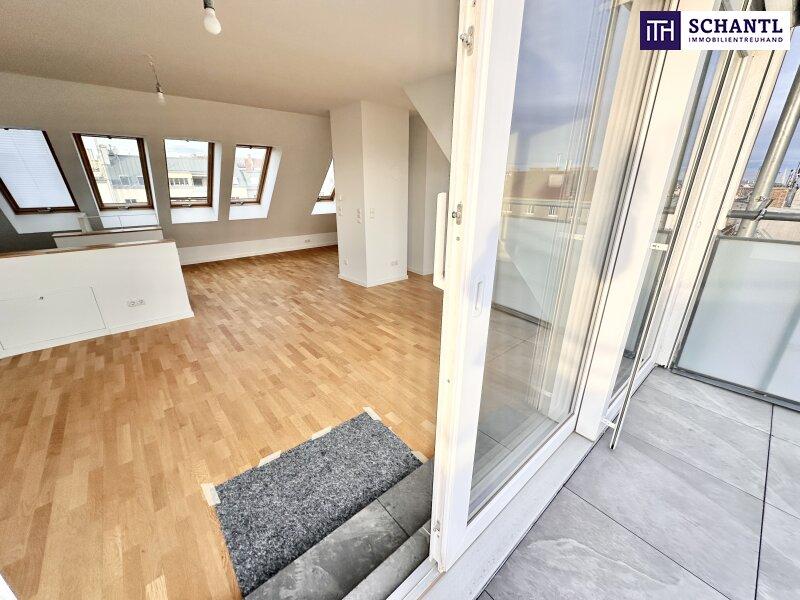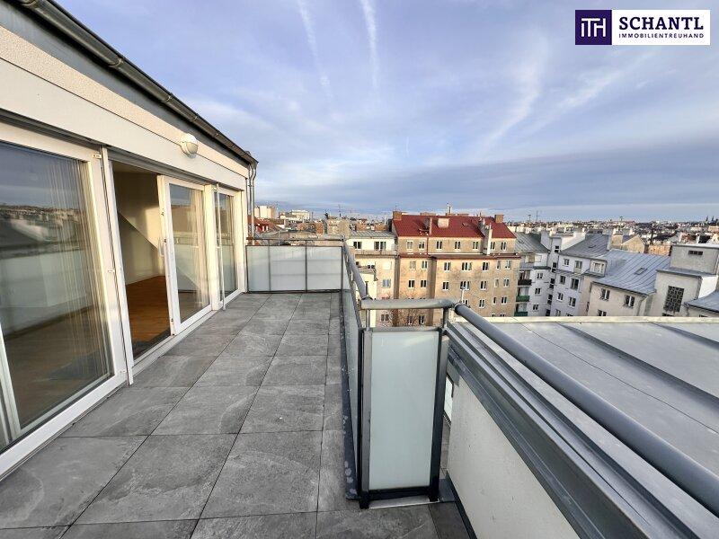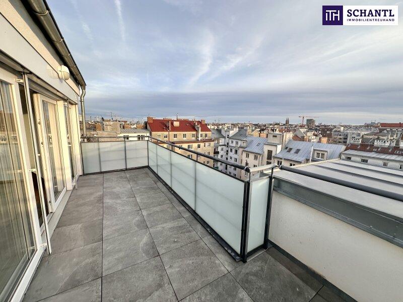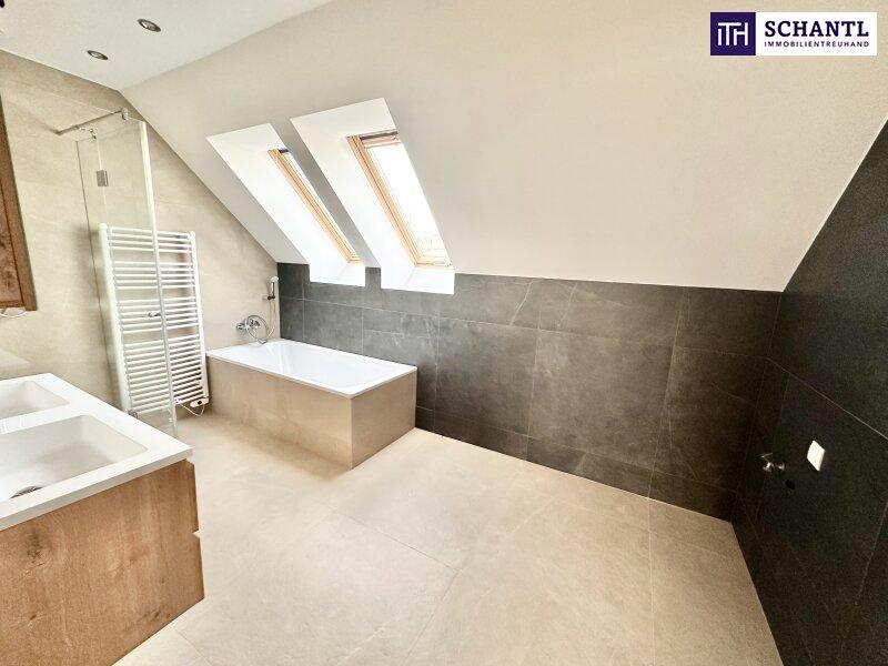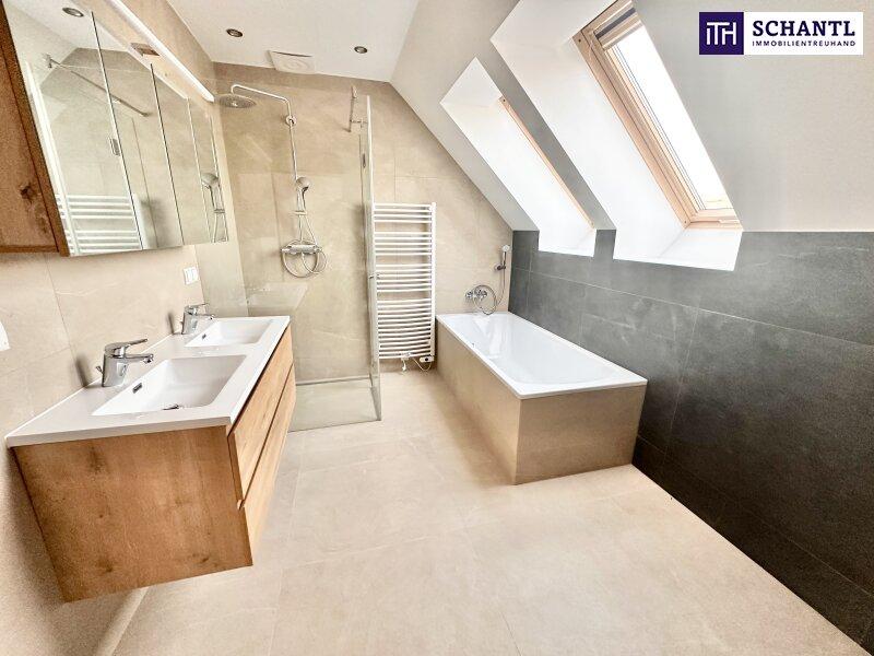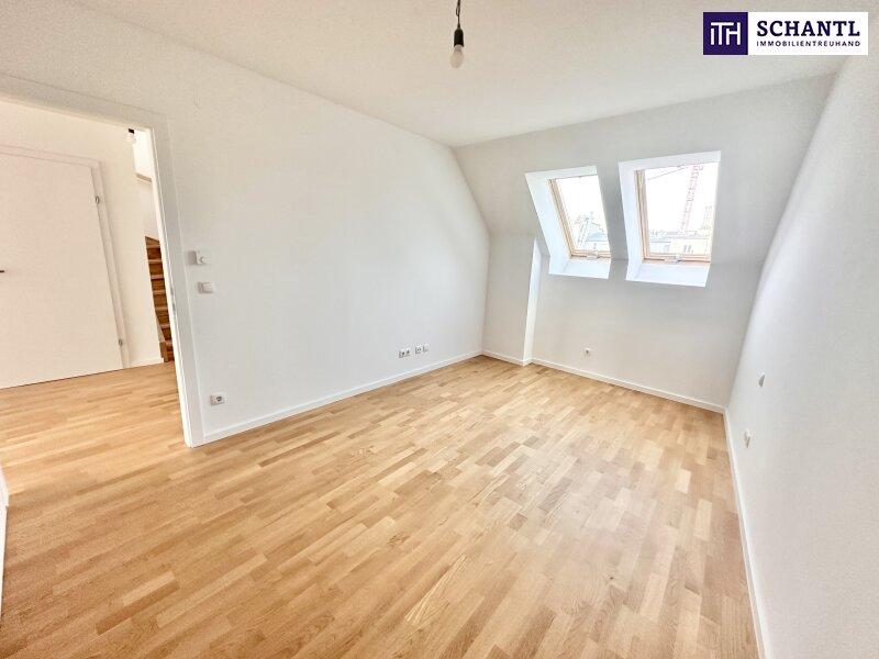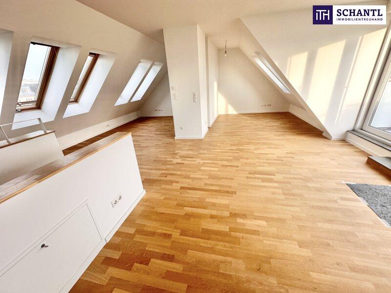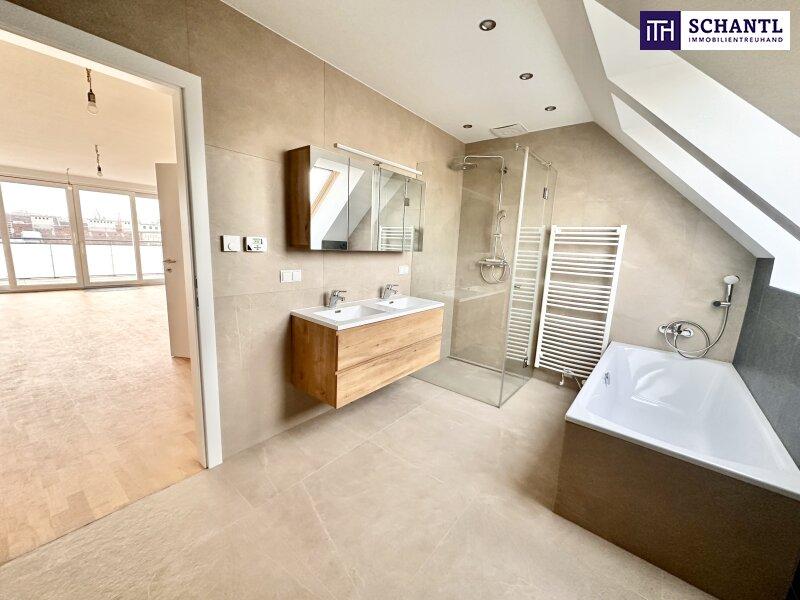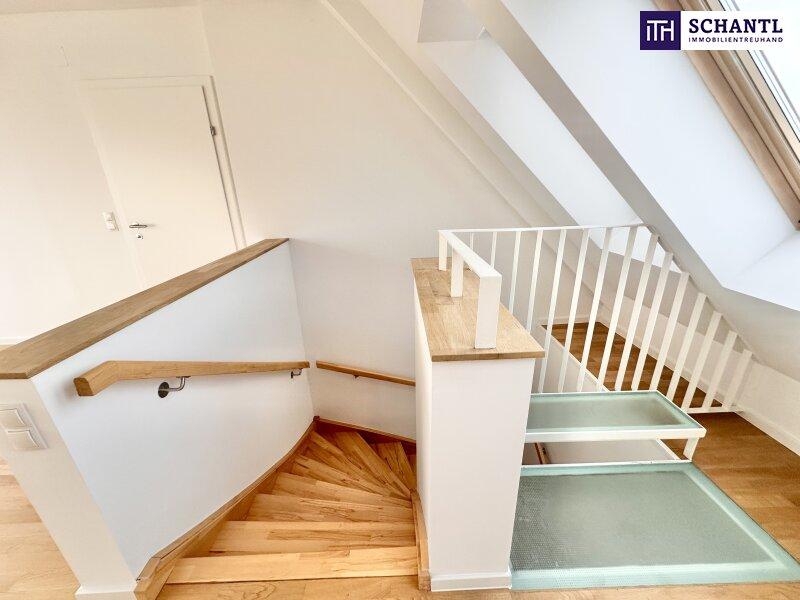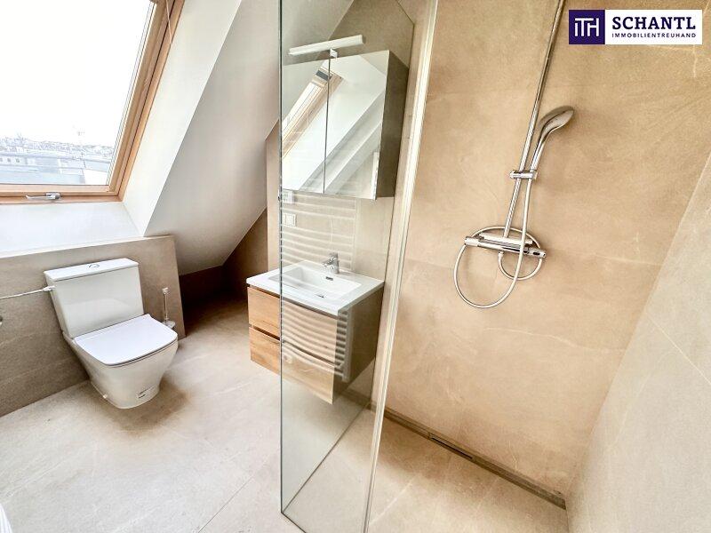 Im oberen Geschoss erwartet Sie ein beeindruckender Wohnraum mit knapp 50 m² Fläche. Dieser Bereich lässt sich flexibel nutzen und kann bei Bedarf in zwei weitere Räume unterteilt werden. Das zweite Badezimmer ist mit Dusche, Waschbecken und WC ausgestattet. Von hier aus gelangen Sie auf die sonnige Dachterrasse mit 13,70 m², die einen beeindruckenden Panoramablick über die Stadt bietet von der Innenstadt mit Stephansdom und Votivkirche bis hin zum Kahlenberg.
