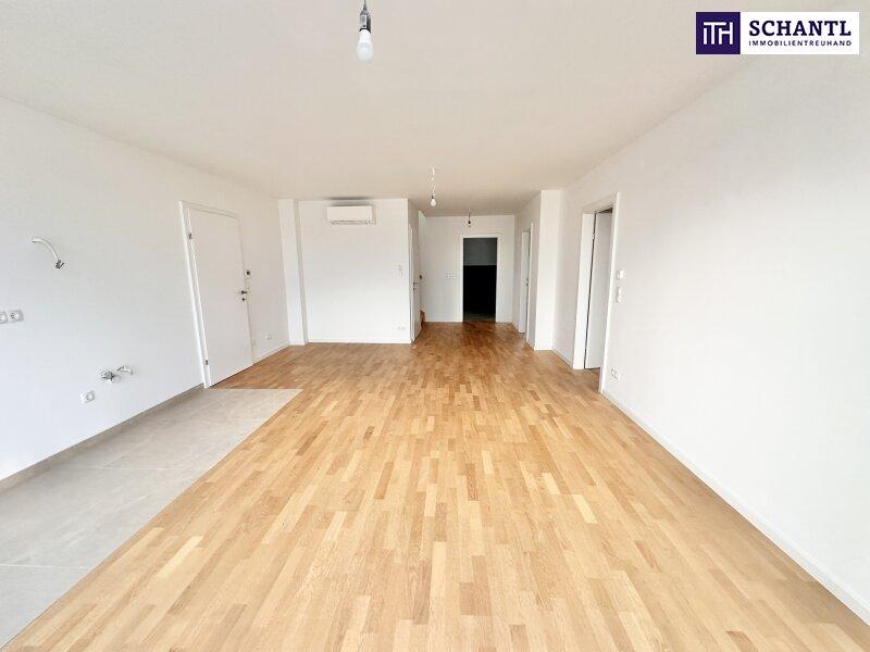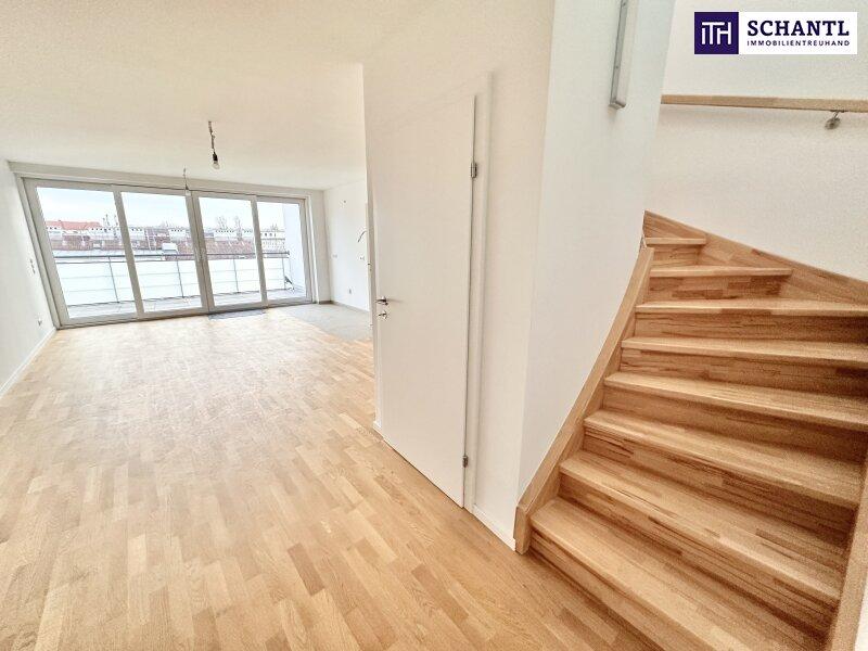 Der Zugang zur Wohnung erfolgt über das untere Geschoss. Hier erwartet Sie ein großzügiges Vorzimmer, das in den lichtdurchfluteten Wohnbereich mit offener Küche übergeht. Zwei weitere Zimmer bieten sich ideal als Schlaf-, Kinder- oder Arbeitszimmer an. Ein großer Abstellraum, ein Gäste-WC und ein luxuriös ausgestattetes Badezimmer mit Doppelwaschbecken, Dusche und Badewanne sorgen für höchsten Wohnkomfort. Der Balkon mit ca. 14,35 m² erweitert den Wohnbereich ins Freie und lädt zum Entspannen ein.