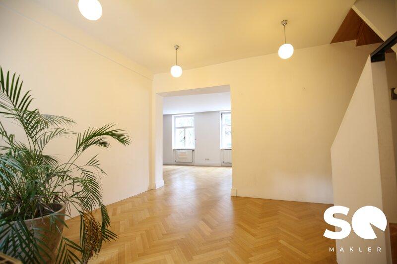Straßenseitig betritt man die Villa und gelangt in einem großzügigen Vorraum. Von hier aus gelangt man rechts in ein straßenseitiges ebenerdiges Schlafzimmer mit eigener Dusche, links in weiteres straßenseitiges ebenerdiges Schlaf/-bzw. Arbeitszimmer sowie in einen großzügigen Wirtschaftsraum, geradeaus befindet sich der Innenhof. Über die denkmalgeschützte Stiege geht man in den Wohnbereich im 1. Stock. Dort befindet sich im denkmalgeschützten Teil des Hauses ein Wohnzimmer (straßenseitig) mit offenem Kamin und angrenzendem Lesezimmer mit Balkon (hofseitig) , rückwärtig ein Esszimmer (hofseitig), dahinter die Küche (Einbauküche) mit Ausgang zu einer weiteren Terrasse (hofseitig) Ebenso hofseitig, befindet sich der sehr ruhige Master-Bedroom mit angrenzendem Marmor-Bad und Zugang auf die hofseitige Terrasse. Eine Holzstiege führt hinauf ins ausgebaute Dachgeschoss: dort befinden sich weitere 2 Schlafzimmer mit einem gemeinsamen Bad, die auch hofseitig ausgerichtet sind.