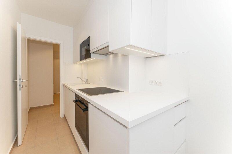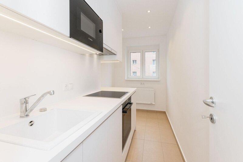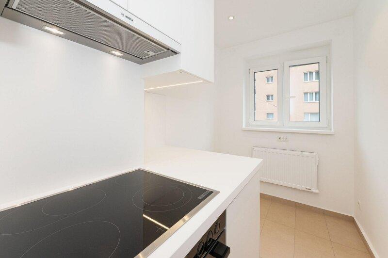 Die maßangefertigte Tischlerküche mit Markengeräten von Bosch ist mit Backofen, Ceran-Kochfeld, Dunstabzug, Kombikühlschrank, Geschirrspüler und Mikrowelle bestückt. In der Küche gibt es außerdem Platz für einen Esstisch. Der Abstellraum wird mit Waschmaschine und Trockner übergeben. Die Fenster der Wohnung wurden auf 3-fach verglaste Kunststofffenster mit elektrischen Außenjalousien erneuert. Alle Fenster der Wohnung sind nach Südwesten ausgerichtet. Die Böden in den Wohnräumen sind mit hochwertigem Eichenparkett und in den Sanitärräumen mit Sochor-Fliesen ausgestattet. Die Beheizung der Wohnung erfolgt über moderne Elektro-Heizkörper von Vaillant und die Warmwasseraufbereitung über einen Bosch Elektro-Durchlauferhitzer.