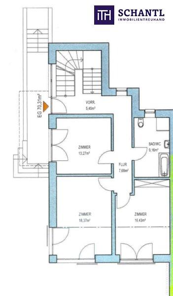 - im EG befinden sich 3 geräumige Schlafzimmer, ein großes Badezimmer mit ca. 8,5m², mit Fenster, Badewanne, Dusche und WC, KEIN Waschmaschinenanschluss!