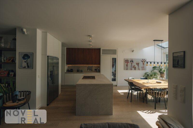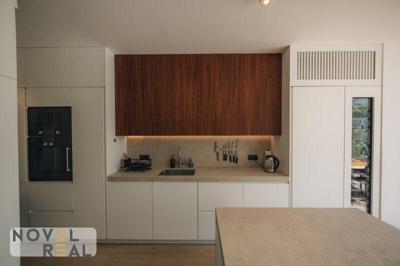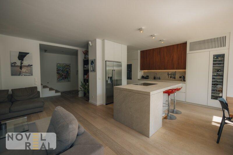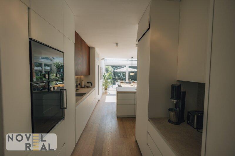 Die exklusive offene Designerküche, entworfen von renommierten Architekten, bietet edle Eleganz und hohe Funktionalität. Ausgestattet mit hochwertigen Geräten (Gaggenau) ist sie ein Highlight des Zuhauses und ein Traum für Hobbyköche und Profis. Der offene Kamin im Wohnbereich verspricht gemütliche Abende.