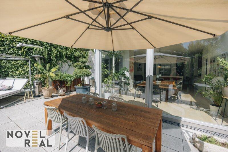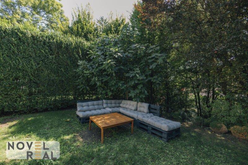 Die großzügige Terrasse bietet einen gemütlichen Sitzbereich, der sich perfekt zum Sonnenbaden und Genießen sonniger Tage eignet, während der Garten einen grünen Loungebereich und einen idyllischen Rückzugsort im Freien bietet.