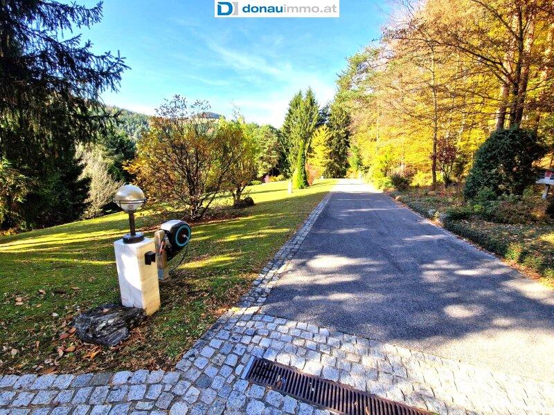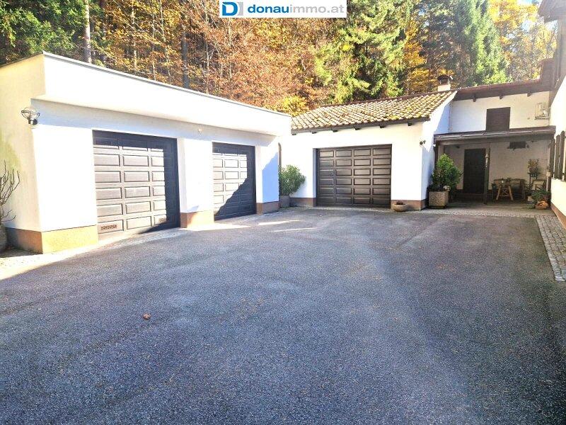 Über eine Privatstraße führt der Weg zu Ihrem neuen Zuhause in einen Innenhof, von dem sowohl das Haupthaus, die großzügige Doppelgarage und das Nebengebäude begehbar sind.