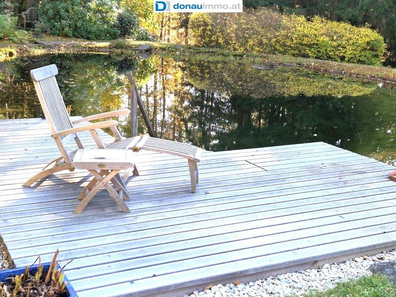 Auf der wunderschönen, ca. 120 m² großen Terrasse lässt sich in stimmungsvoller Atmosphäre ein Mittagessen genießen und/oder der Abend mit einem Glas Wein ausklingen. Von hier aus können Sie den bezaubernden Anblick des harmonisch in das sanfte Grün eingebetteten Schwimmteichs besonders gut auf sich wirken lassen.