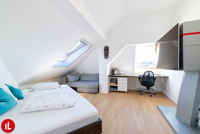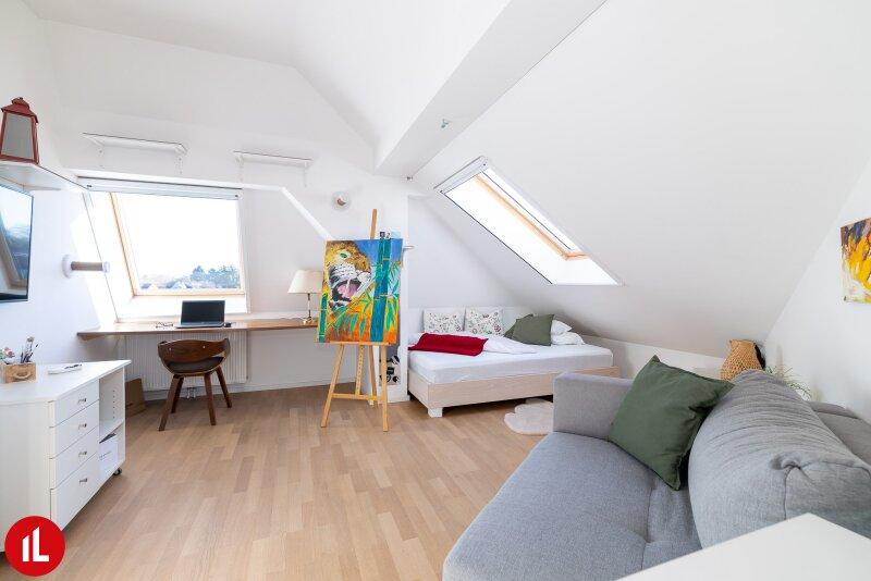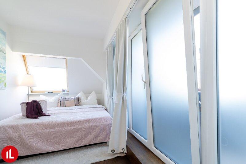 Großzügige Fensterfronten sorgen für viel Tageslicht in allen Räumen. Ein Schlafzimmer bietet ebenfalls Zugang zur Terrasse, während zwei weitere Zimmer mit Dachfenstern und Weitblick punkten.