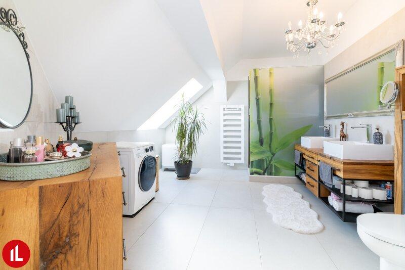 Ein weiteres Highlight ist die 25 m² große Badeoase, ausgestattet mit Walk-in Dusche, Doppelwaschbecken, WC und Handtuchheizkörper ein luxuriöser Rückzugsort zum Wohlfühlen. Zusätzlich gibt es ein separates Gäste-WC mit Handwaschbecken.