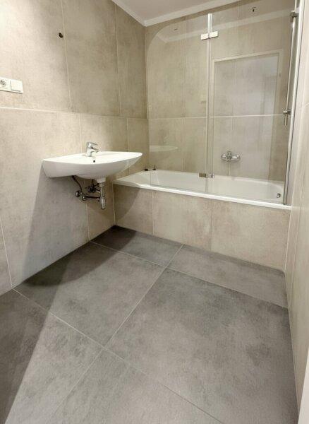 Das Badezimmer präsentiert sich elegant mit neuer Verfliesung und Badewanne, das WC ist separat.