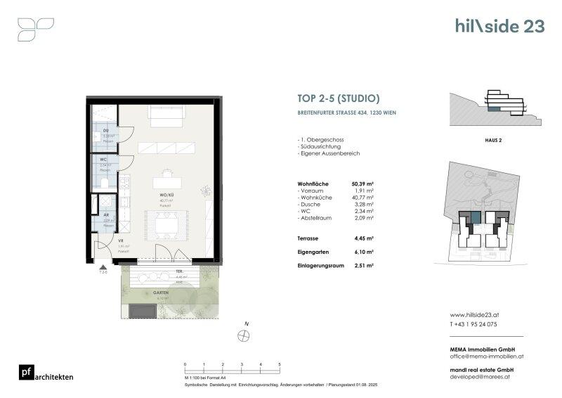 Zum Verkauf steht eine ca. 50 m² große 1-Zimmer-Gartenwohnung in einem Ende 2027 fertig werdenden Neubau. Die Wohnung befindet sich im 1. Obergeschoss. Die Wohnung blickt in die Breitenfurter Strasse Richtung Süden.