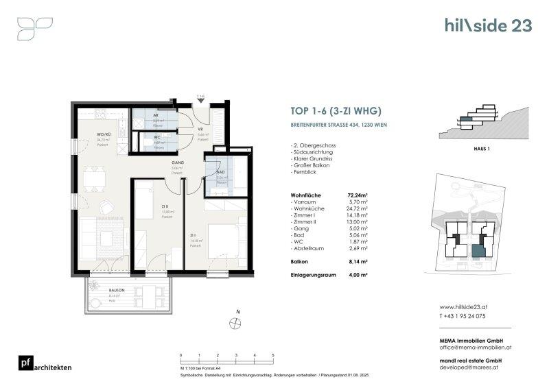 Zum Verkauf steht eine ca. 72 m² große 3-Zimmer-Balkonwohnung in einem Ende 2027 fertig werdenden Neubau. Die Wohnung befindet sich im 2. Obergeschoss. Die Wohnung blickt in die Breitenfurter Strasse Richtung Südwesten.