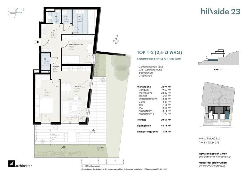 Zum Verkauf steht eine ca. 79 m² große Gartenwohnung mit 2,5 Zimmer in einem Ende 2027 fertig werdenden Neubau. Die Wohnung befindet sich im Erdgeschoss. Die Wohnung blickt in die Breitenfurter Strasse Richtung Südosten.