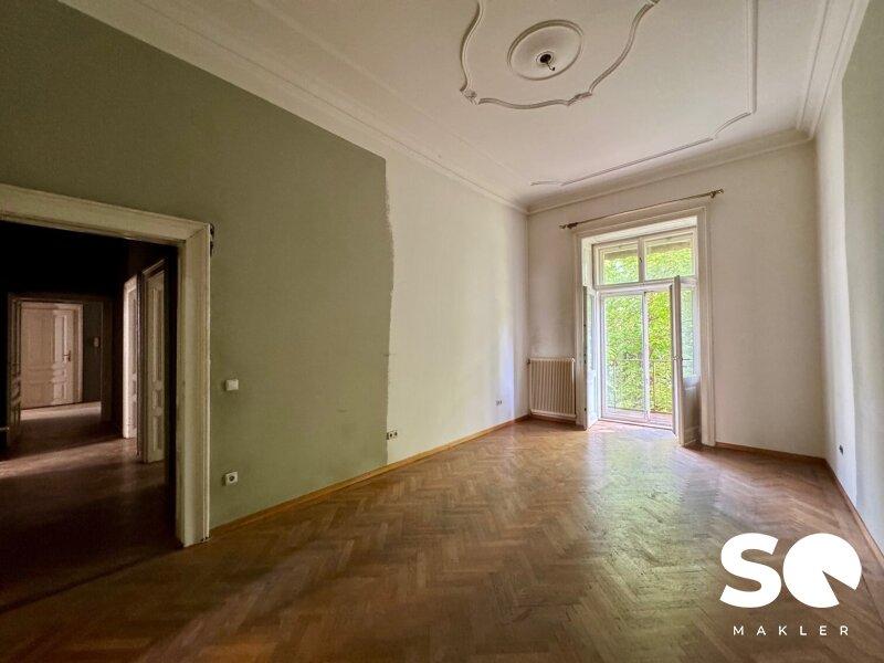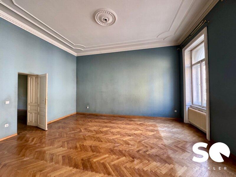 Die Wohnung befindet sich im 2. Obergeschoß in einem schönen Gründerzeithaus mit gegliederter Fassade.