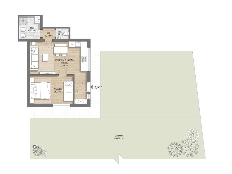 Diese Ferienwohnung befindet sich im Erdgeschoss und bietet eine Wohnfläche von 42,50 m². Ein besonderes Highlight ist der großzügige Eigengarten mit ca. 400 m².