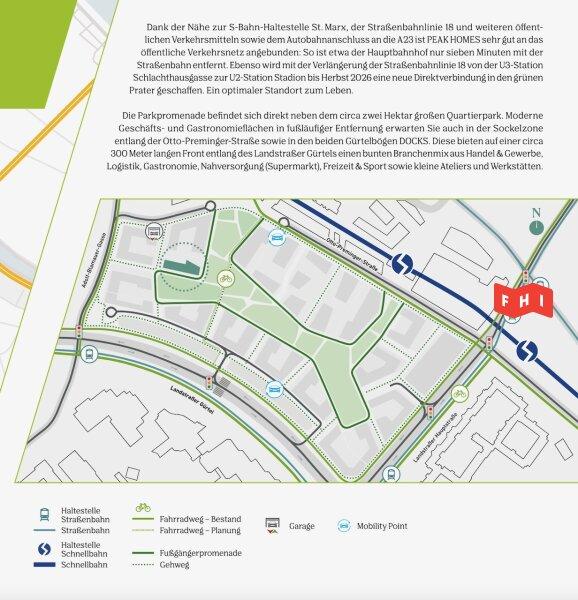 Die Lage der Wohnung zeichnet sich auch durch eine gute Verkehrsanbindung - Schnellbahnstationen St. Marx (Richtung Flughafen - Wien Mitte), Rennweg u. Quartier Belvedere Richtung Meidling - Floridsdorf, Hauptbahnhof, die Straßenbahnlinien 1, 18 u. 71 (Richtung Schwarzenbergplatz - Ring - Zentralfriedhof - U3 Schlachthausgasse - Hauptbahnhof - U1), die Autobuslinien 74A (Richtung Landstraßer Hauptstraße - U3) - und eine lückenlose Nahversorgung mit Billa Plus, DM, Spar, und Einkaufsstraße-Landstraßer Hauptstraße, sowie wie die zahlreichen Einkaufsmöglichkeiten am Wiener Hauptbahnhof (7 Tage/Woche) aus.