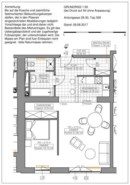 Die Wohnung bietet eine Wohnfläche von rund 56,5 m² und gliedert sich wie folgt: