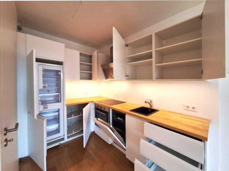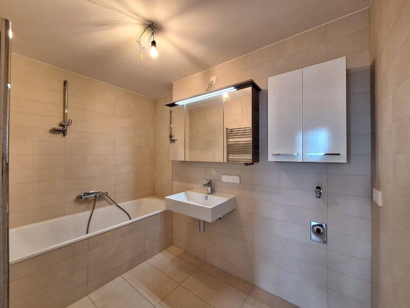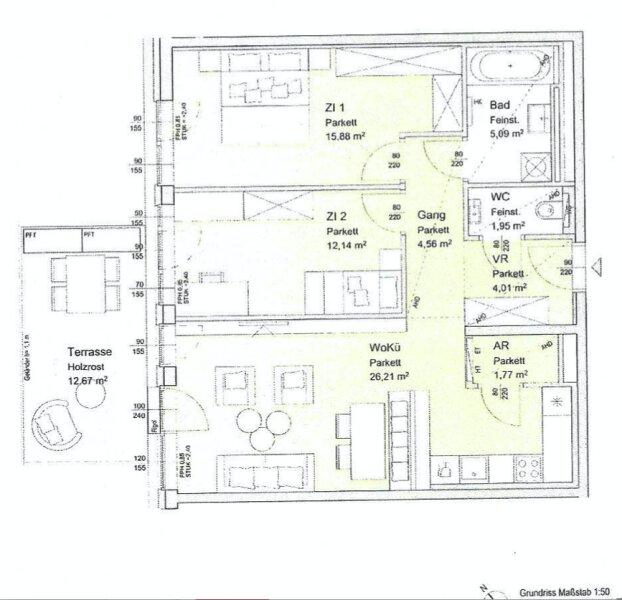 Dem Zeitgeist entsprechende Raumaufteilung umfasst eine offene Wohnküche mit Einbauküche und zwei Schlafzimmer. Das Badezimmer ist mit einer Badewanne ausgestattet und ist von der Toilette getrennt.