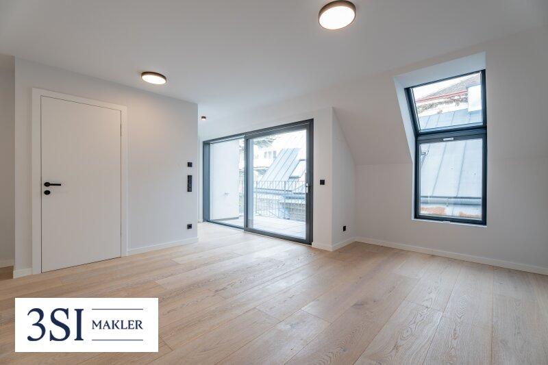 Die Dachgeschosswohnungen drei Einheiten im 1. Dachgeschoß und das Penthouse im 2. Dachgeschoß bilden das architektonische Highlight des Projekts. Großzügige Fensterfronten lassen die lichtdurchfluteten Räume erstrahlen und eröffnen eindrucksvolle Ausblicke über die Stadt.