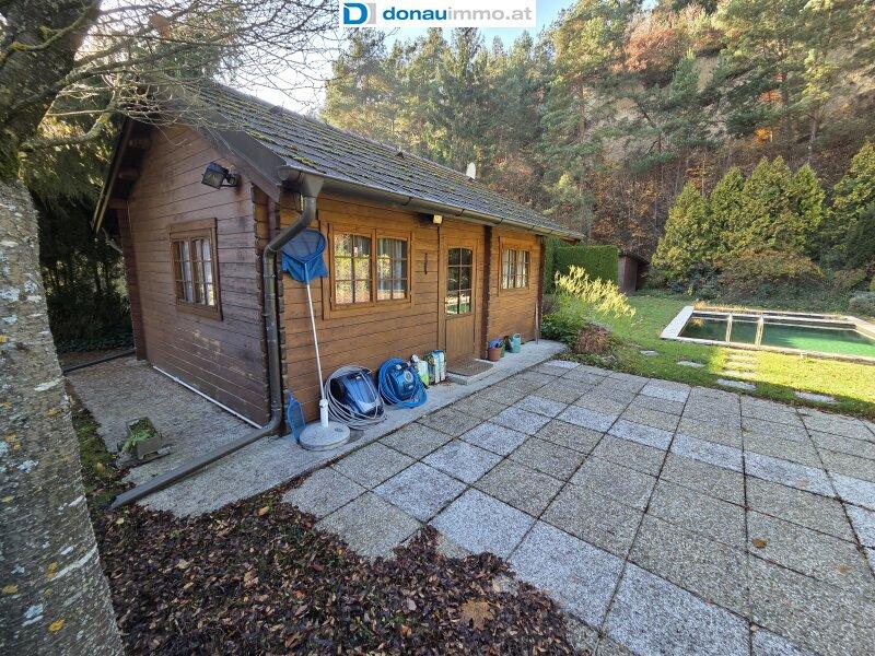 Der Pool besteht aus 2 Teilen, 1 Teil zum Schwimmen, einen zweiten Teil als Ausgleich und Erhalt der Wasserqualität - dieser ist bepflanzt. Weiters gibt es im rückwärtigen Gartenteil einen Geräteschuppen.