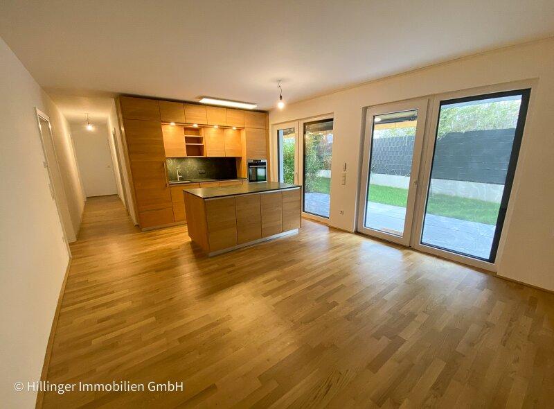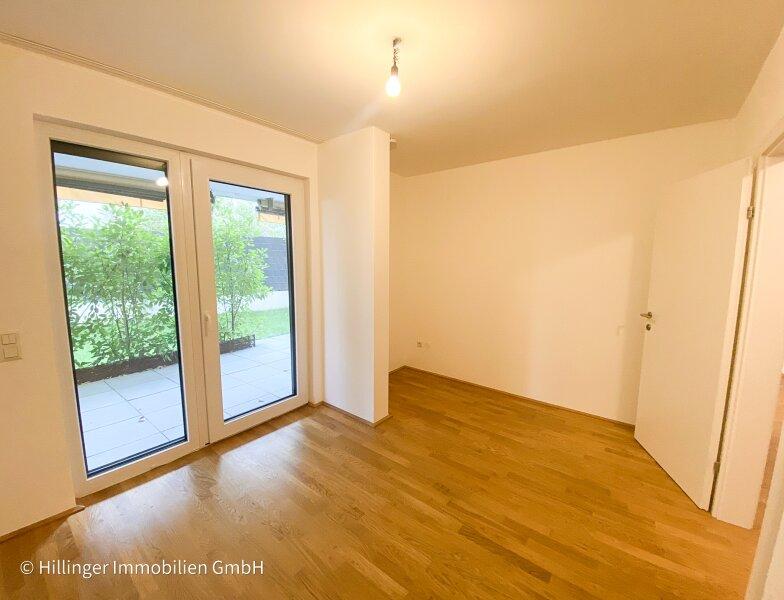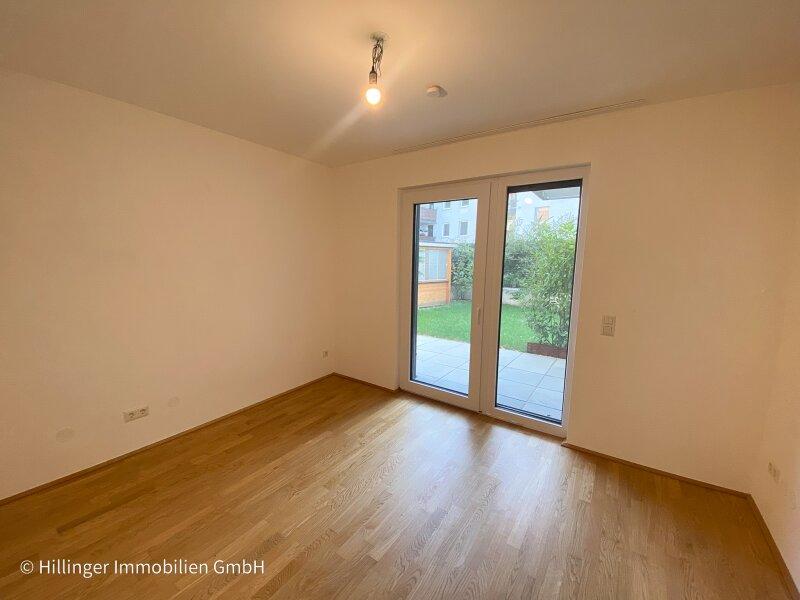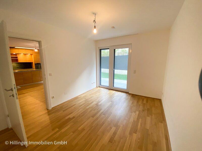 Alle Zimmer bieten direkte Sicht und Ausgang in den Gartenbereich. So kann man aus der ganzen Wohnung den Blick ins Grüne genießen und auch die groß dimensionierten Terrassentüren öffnen perfekt für laue Frühlingstage! Durch die Ausstattung mit Fliegengittern kann man die Türen ruhig geöffnet lassen. An heißen Tagen können die Außenrollos vollautomatisch durch Betätigen der Taster elektrisch geschlossen werden.