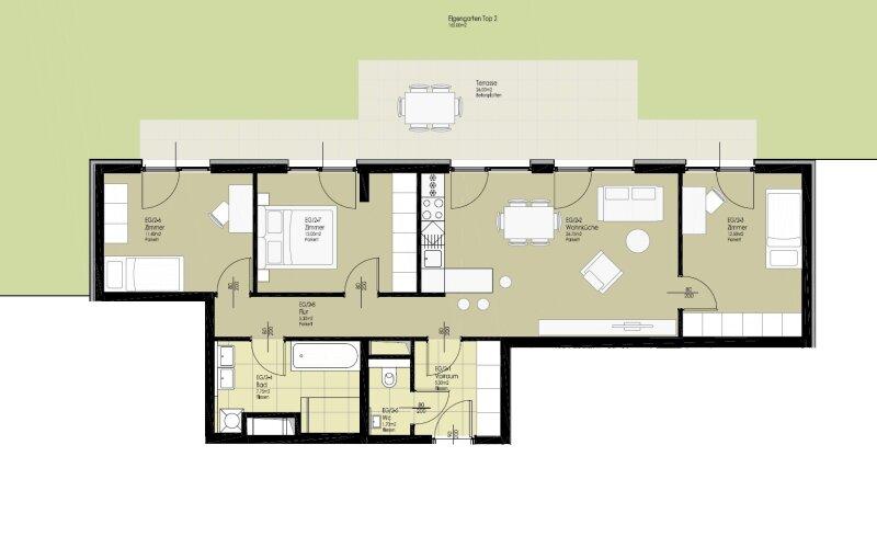 Nach Betreten der Wohnung findet man sich im großen Vorraum wieder, der genügend Platz für eine große Garderobe oder einen Vorzimmerschrank bietet. Direkt hier gelangen Gäste auch zur Toilette. Direkt im Anschluss wartet bereits der offene Wohnraum, welcher lichtdurchflutet ist und mit offener Küche ein echtes Highlight bietet (die Küche ist nicht inkludiert).