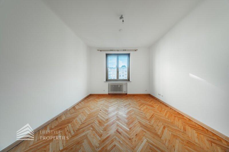 Straßenseitig befinden sich zwei Schlafzimmer, ein ca. 14 m² großes Zimmer, ideal als Kinder-, Gäste- oder Arbeitszimmer, sowie ein großzügiges ca. 19 m² Hauptschlafzimmer, welches über einen direkten Zugang zum Badezimmer verfügt. Das modernisierte Badezimmer ist sowohl vom Hauptschlafzimmer als auch vom zentralen Vorraum aus begehbar und mit Badewanne und WC ausgestattet. Zusätzlich steht ein separates Gäste-WC zur Verfügung.