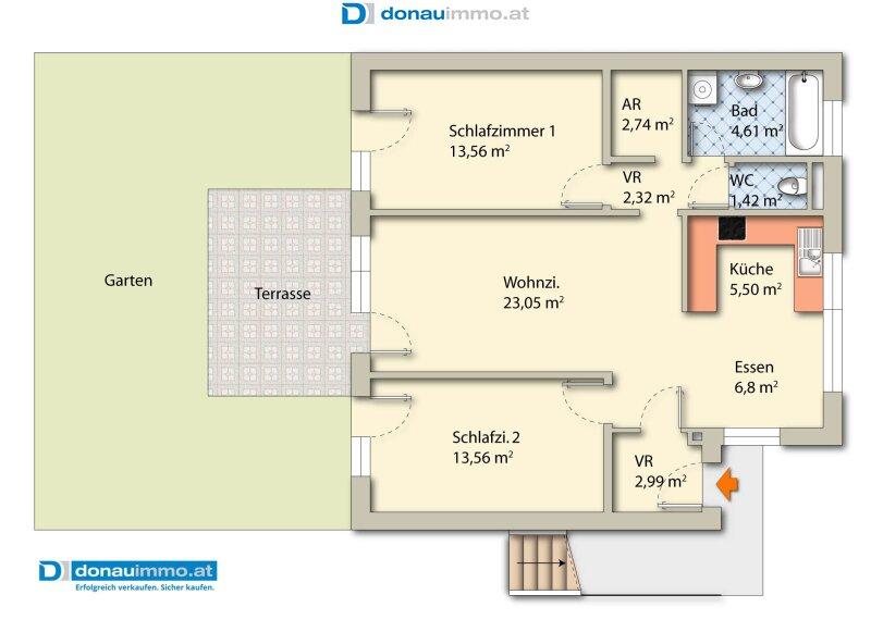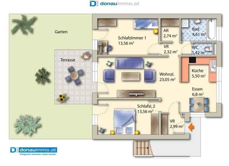 Wir bieten eine ca. 76m2 große Dreizimmer-Gartenwohnung Nähe Shopping Center Murpark. Die Wohnanlage wurde 2000 fertiggestellt und ist sehr gut gepflegt. Es handelt sich um eine kleine, private Wohnanlage mit wenigen Wohneinheiten am Ende einer Sackgasse. Die Raumaufteilung ist offen und modern, die Erschließung zentral und barrierefrei. Einbauküche, Badezimmer und WC wurden liebevoll möbliert und sind im Preis inbegriffen! Parken ist in der Wohnanlage in der Tiefgarage (optional) möglich, Besucherparkplätze befinden sich vor dem Haus. Vor dem Wohnungseingang befindet sich noch eine kleine überdachte Terrasse die mitbenutzt werden kann. Das komfortable Entre bietet Platz für eine moderne Garderobe und ist über eine Türe zum Wohnraum hin abgegrenzt sodass ein Windfang entsteht. Der Wohn-Ess-Küchenbereich mit ca. 36m2 und Zugang zum eigenen Garten bildet das Herz der Wohnung. Die Beiden Schlafzimmer mit jeweils ca. 13,6m2 sind durch den Wohnraum voneinander getrennt und haben ebenfalls direkten Gartenzugang über große Fensterfronten mit Balkontüren. Tageslicht-Bad und WC sind getrennt. Der separate Abstellraum rundet den Grundriss ab. Zusätzlich verfügt die Wohnung über ein großes Kellerabteil. Der private Eigengarten gehört zur Wohnung, erstreckt sich über die gesamte Breite der Wohnung, ist eingezäunt und mit einer Hecke blickdicht verwachsen.