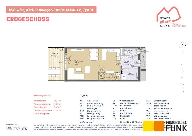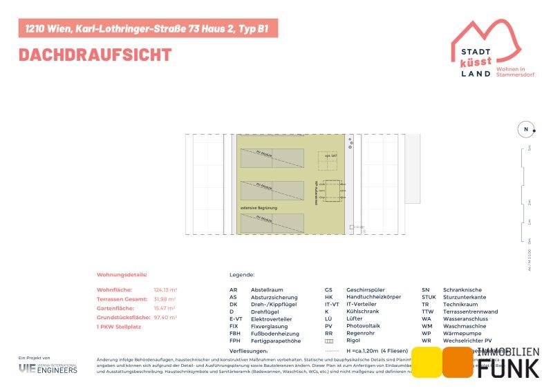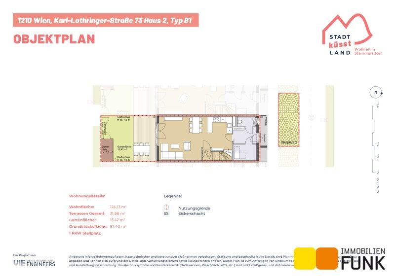 Das Reihenhaus 2 befindet sich in der Karl-Lothringer-Straße 73, 1210 Wien und wird auf einem ca. 97 m² großen Eigengrund errichtet. Seinen künftigen Bewohnern bietet es zudem eine komfortable Wohnfläche im Ausmaß von insgesamt ca. 124 m², angeordnet auf drei Geschoßen mit 5 Zimmern, 2 Toiletten, einem großen Badezimmer, dem Technikraum und einem Abstellraum, sowie einer südseitig ausgerichteten Terrasse mit ca. 12 m², die sich zu einem gemütlichen Gartenbereich mit ca. 15 m² öffnet. Im Dachgeschoß befinden sich zudem zwei Dachterrassen mit ca. 10 m² und 8 m². Diesem Reihenhaus ist ein Parkplatz direkt vor der Haustüre zugewiesen. Der Kaufpreis für den KFZ-Platz beträgt 19.000,00 € .