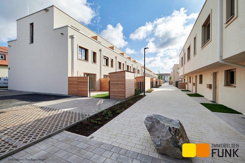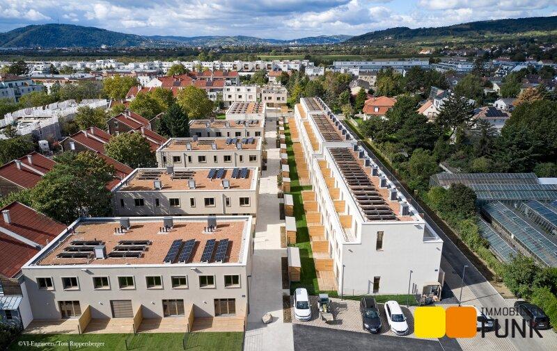 Das soeben fertiggestellte Neubauprojekt STADT küsst LAND ist ein Bauvorhaben von VI-Engineers Bauträger GmbH & Co KG und entsteht zentrumsnah in Stammersdorf auf einem ca. 10.000 m² großen Areal, eingebettet zwischen Brünner Straße und Jedlersdorfer Straße in 1210 Wien. Es umfasst insgesamt 46 freifinanzierte Reihenhäuser mit Eigengärten und Terrassen sowie 53 zugewiesene PKW-Stellplätze mit nachrüstbarer E-Lademöglichkeit. Ansprechende Grundrisse, eine werthaltige Qualität dank Ziegelmassivbauweise, ein nachhaltiges Energiekonzept mit hauseigener Luftwärmepumpe und Photovoltaik-Anlage am Dach, eine hochwertige Ausstattung wie Fußbodenheizung, außenliegender Sonnenschutz mit Elektroantrieb, Eichenparkettböden und Feinsteinzeug zeichnen zudem das moderne Projekt aus. Alle Bilder: © VI-Engineers/ Toni Rappersberger. Fotos Innenräume: Musterhaus. Machen Sie sich selbst ein Bild- wir führen Sie gerne durch die Häuser.