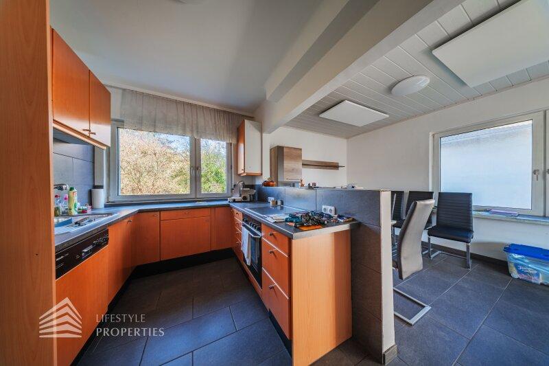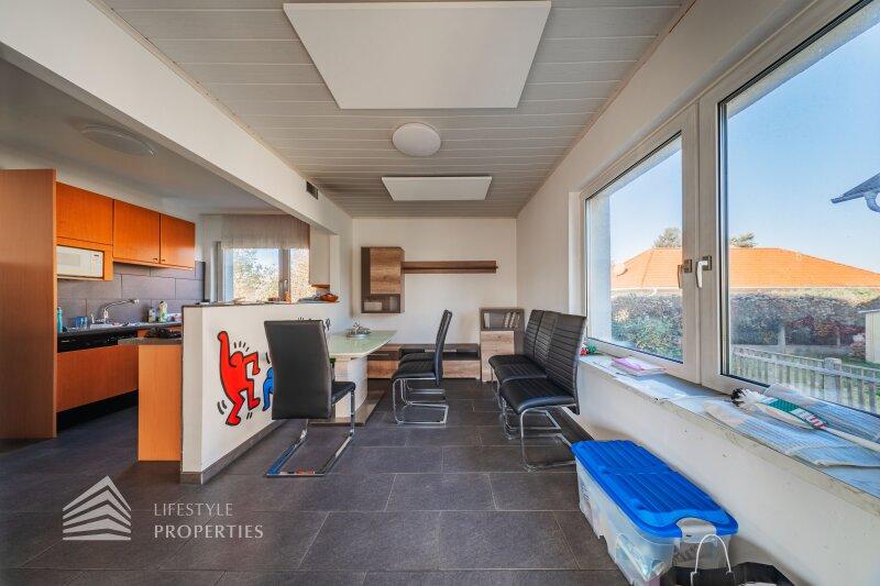 Eine Garage mit etwa 60 m² sowie weitere Außenstellplätze bieten komfortable Parkmöglichkeiten. Die Liegenschaft verfügt über eine Zentralheizung, wobei sowohl Elektro- als auch Ölheizung gegeben sind. Eine gepflegte Einbauküche sowie ein kleiner Terrassenbereich von etwa 3 m² runden das Angebot ab. Der Zustand ist sehr gut und bietet eine solide Basis für individuelle Modernisierungen oder persönliche Ausbauwünsche.