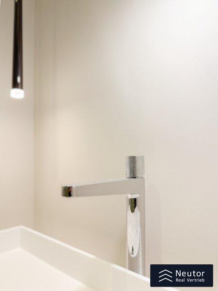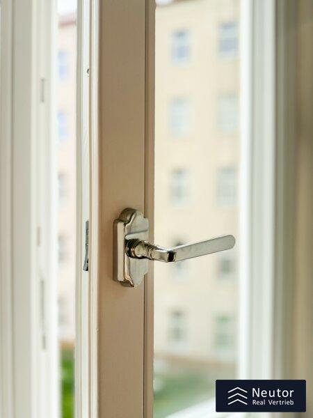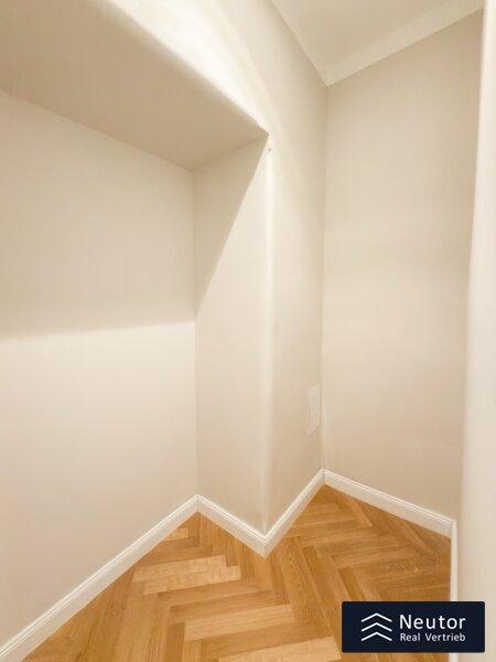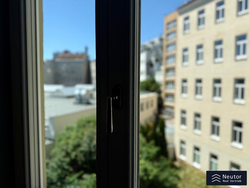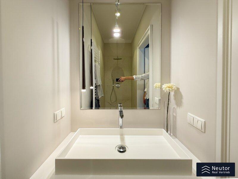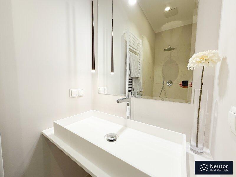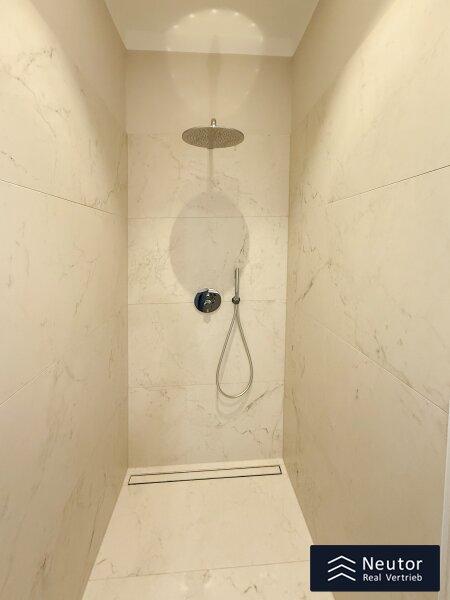 Das Badezimmer ist ein kleines Paradies: Eine stilvolle Dusche, umgeben von großflächigen, hochwertigen Fliesen, lädt zum Entspannen ein, während das separate WC mit Handwaschbecken den Alltag praktisch und elegant ergänzt. Beide Nassräume strahlen in luxuriösem Glanz und vereinen Funktionalität mit Ästhetik. Drei-fach-Isolationsfenster im klassischen Altwiener Stil rahmen die Welt draußen ein, halten die Wohnung warm und die Stadtgeräusche fern. Und für den perfekten Komfort Eine clevere Nische verbirgt den Waschmaschinenanschluss und die Therme, sodass nichts die harmonische Optik stört.