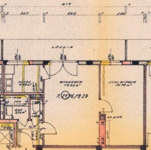 Die Aufgliederung: Schlafzimmer, Wohnzimmer, separate Küche, separates WC, Bad mit Wanne; Vorzimmer mit Garderobe, verglaste Loggia, zusätzlich ein großes Kellerabteil.