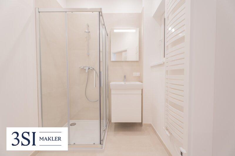 - Badezimmer mit Dusche, Lichtspiegel, Waschtisch und Handtuchheizkörper