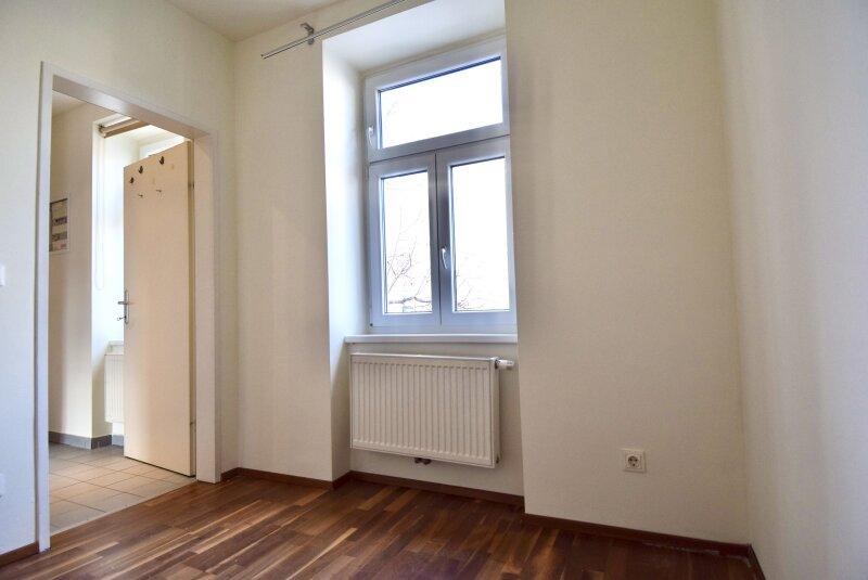 Das sonnige Wohnzimmer bietet einen schönen Ausblick, darüber hinaus verfügt diese Wohnung über ein hofseitig gelegenes Schlafzimmer, einen Vorraum mit Küchenzeile und ein Badezimmer mit Wanne und WC.
