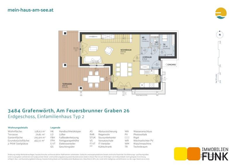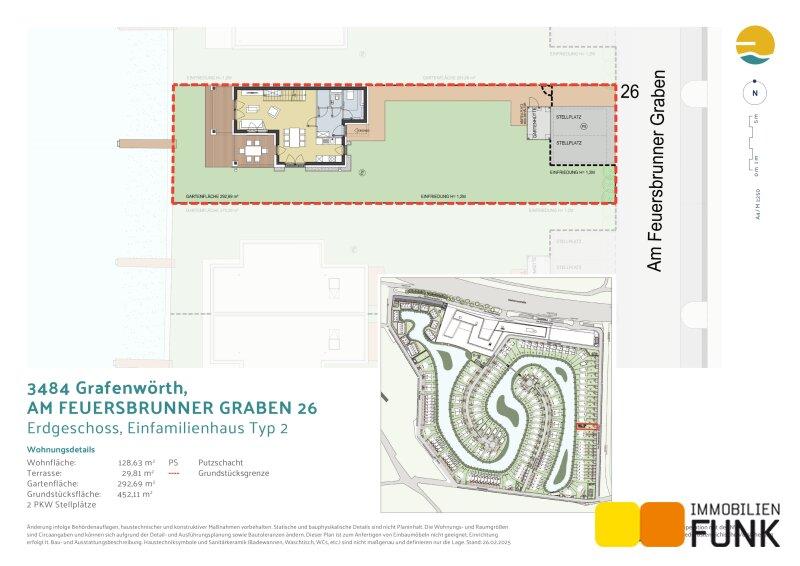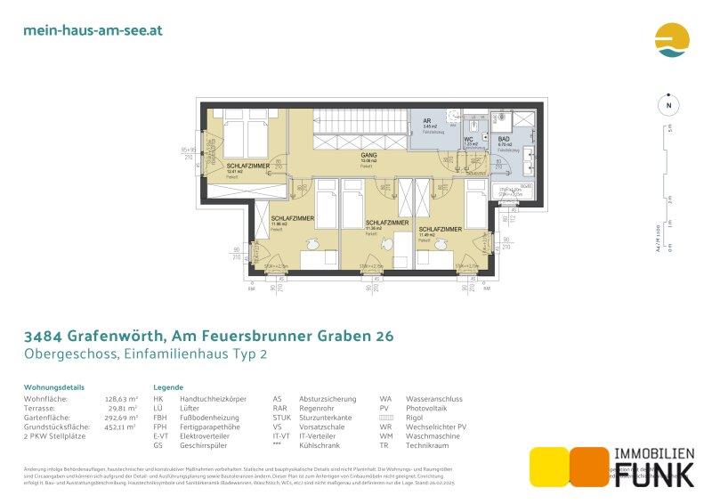 Vor dem Eingang zum Haus haben Sie zwei KFZ-Stellplätze, einen kleinen Vorplatz sowie die ca. 4,5 m² große Gartenhütte. Die Grundstücksfläche beträgt ca. 452 m². Sie betreten das Einfamilienhaus Am Feuersbrunner Graben 26 über den Vorraum (ca. 6,1 m²), mit Platz für die Garderobe. Rechter Hand finden Sie den Technikraum, das Gäste-WC und einen Abstellraum (ca. 1,7 m²). Gerade aus gelangen Sie in den großen Wohnküchenbereich (ca. 42,5 m²), der sich zur Lärchenholzterrasse (ca. 29,8 m²), dem Garten und zum See hin öffnen. Eine Treppe führt Sie in das Obergeschoss mit vier Schlafzimmern (ca. 12,4 m², 11,9 m², 11,3 m² und etwa 11,4 m²), einem Abstellraum mit Waschmaschinenanschluss (ca. 3,4 m²), einem WC, und dem Badezimmer mit Doppelwaschtisch, Badewanne und Dusche (ca. 6,7 m²).